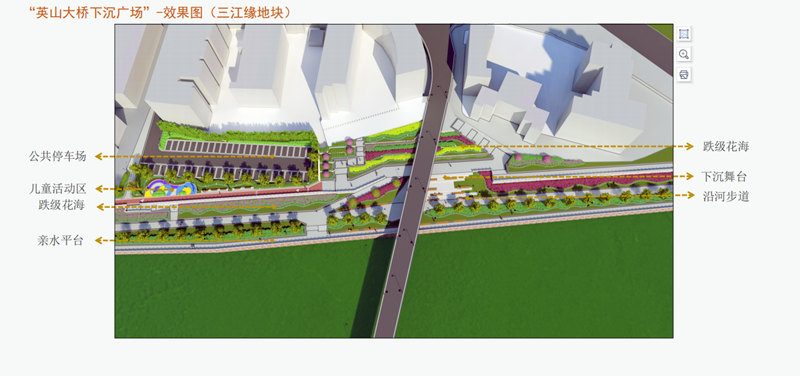 ①南門大橋下沉廣場(chǎng),主要建設(shè)內(nèi)容為跌級(jí)花海、下沉舞臺(tái)、沿河步道(全長(zhǎng)約為2.1KM)、親水平臺(tái)步道(全長(zhǎng)約為2.1KM)。