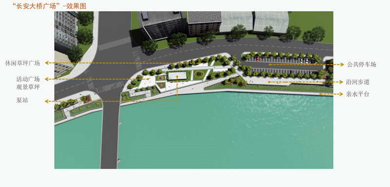 ③長(zhǎng)安大橋廣場(chǎng),建設(shè)面積為6723㎡,主要建設(shè)內(nèi)容為休閑草坪廣場(chǎng)、活動(dòng)廣場(chǎng)、觀景草坪等。
