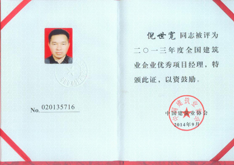 2013年度全國建筑業(yè)企業(yè)優(yōu)秀項目經(jīng)理(倪世寬)