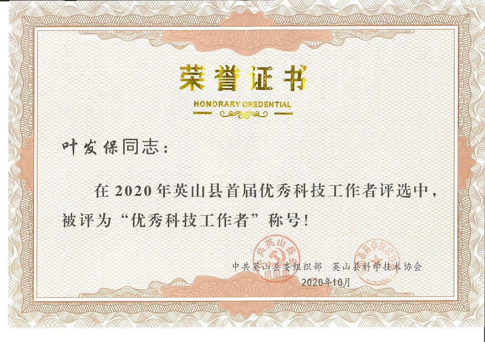 總經(jīng)理葉發(fā)保榮獲“英山縣首屆優(yōu)秀科技工作者”稱號