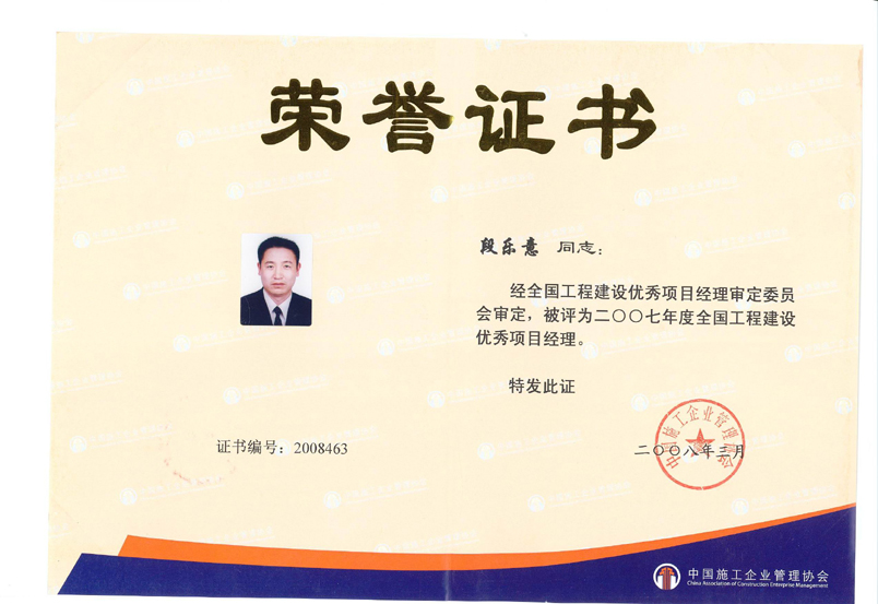 2007年度全國工程建設優(yōu)秀項目經(jīng)理(段樂意)