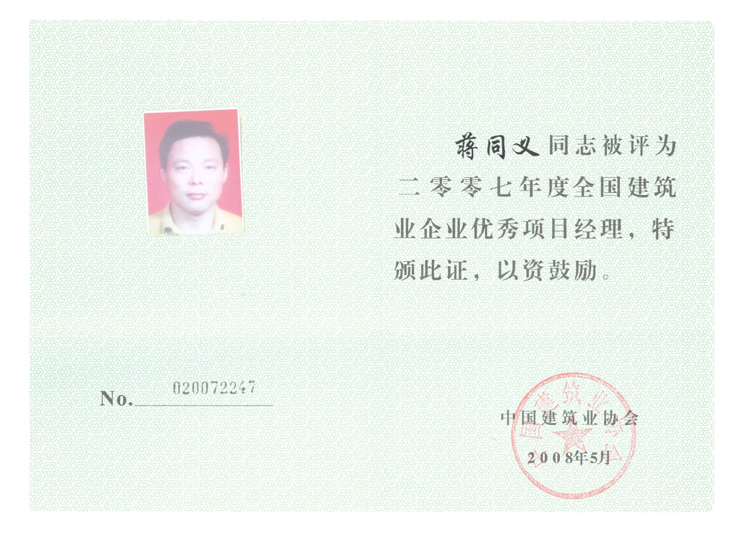 2007年度全國建筑業(yè)企業(yè)優(yōu)秀項目經(jīng)理(蔣同義)