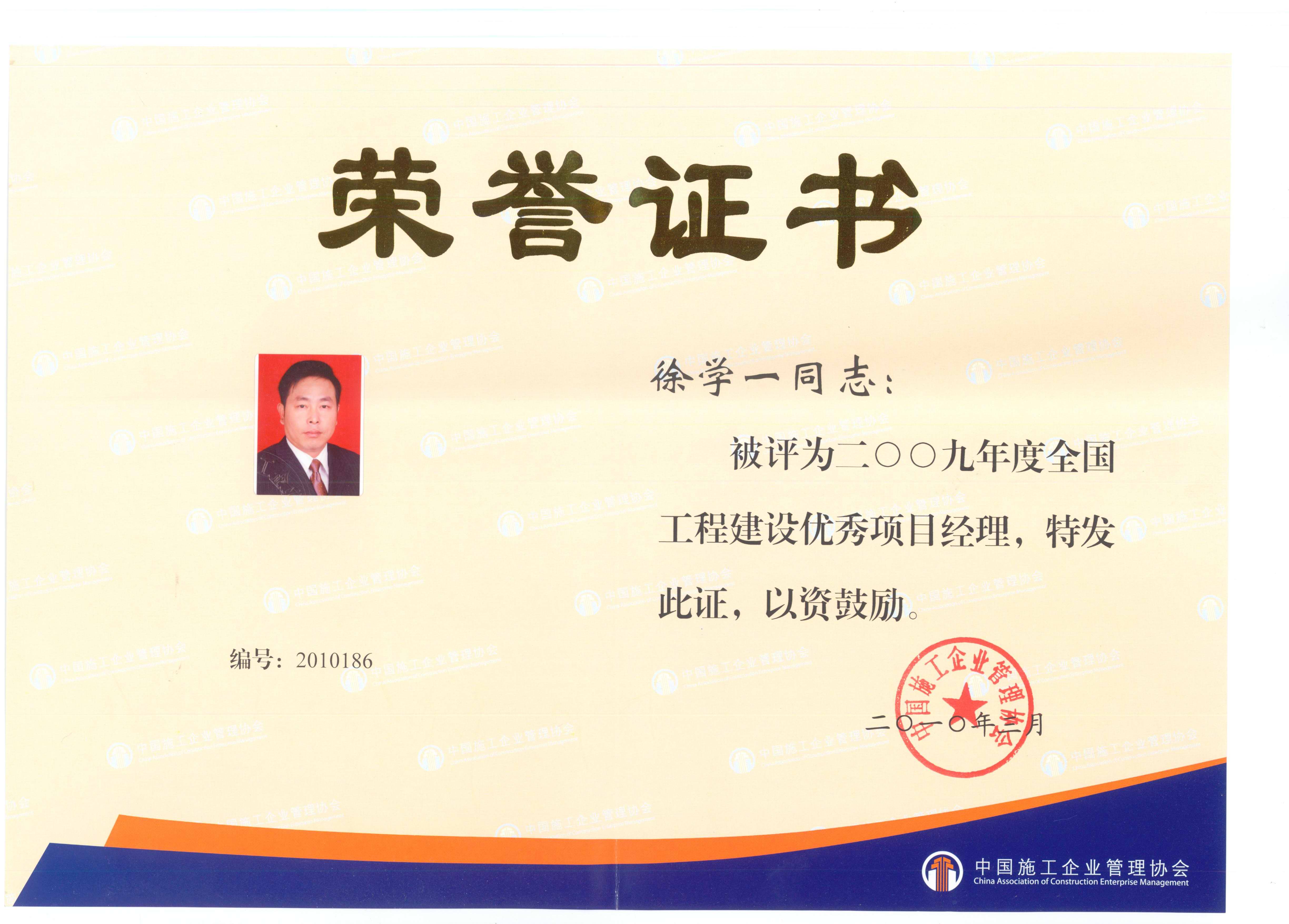2009年度全國工程建設優(yōu)秀項目經(jīng)理(徐學一)