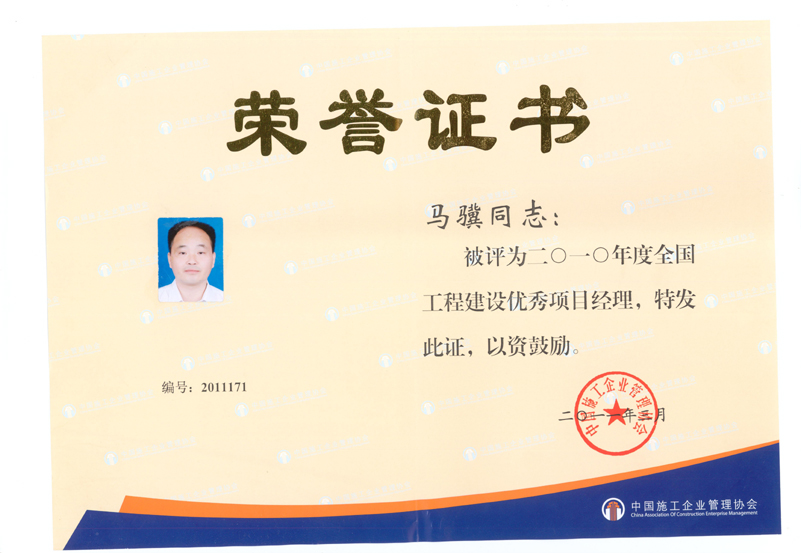 2010年度全國工程建設優(yōu)秀項目經(jīng)理(馬驥)
