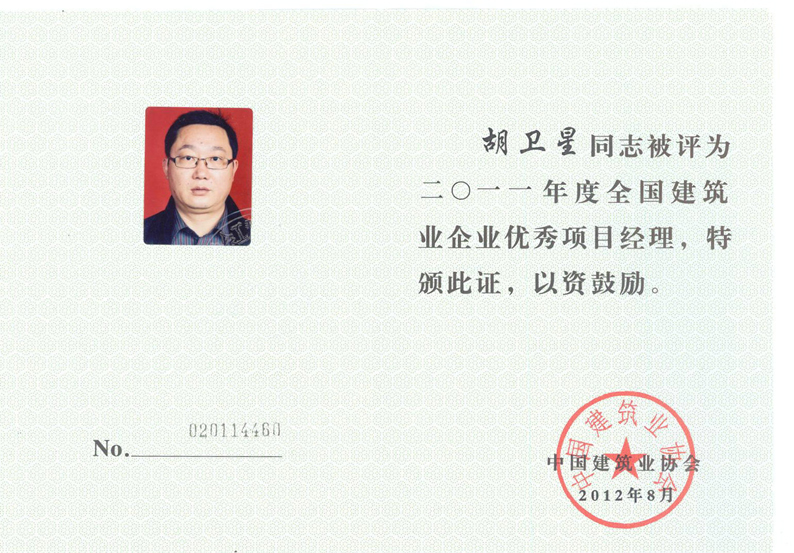 2011年度全國建筑業(yè)企業(yè)優(yōu)秀項目經(jīng)理(胡衛(wèi)星)