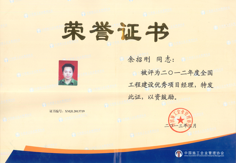 2012年度全國工程建設優(yōu)秀項目經(jīng)理(余招剛)
