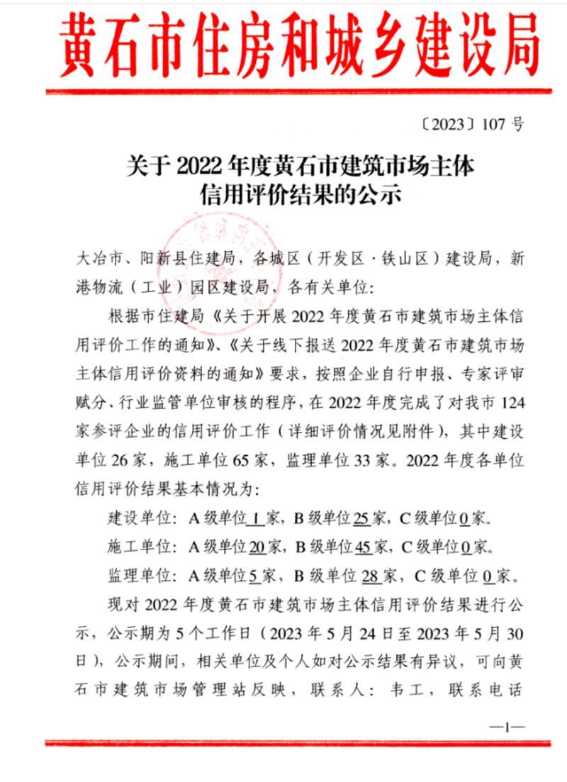 集團(tuán)公司被黃石市住建局評(píng)為建筑市場(chǎng)主體信用A級(jí)單位