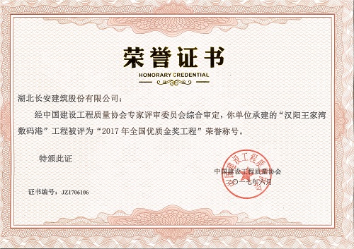 漢陽王家灣數(shù)碼港工程被評為“2017年全國優(yōu)質(zhì)金獎工程”獎牌
