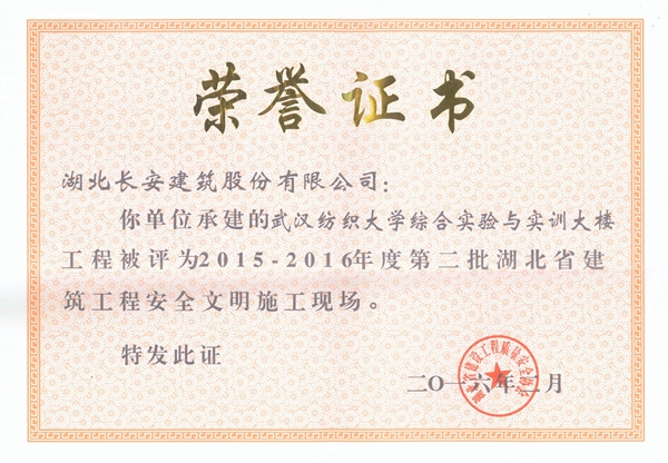 武漢紡織大學(xué)綜合實(shí)驗(yàn)與實(shí)訓(xùn)大樓被評(píng)為2015-2016年度第二批省安全文明施工現(xiàn)場(chǎng)