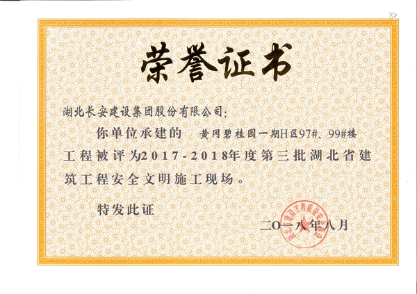黃岡碧桂園二期E區(qū)工程(200#樓、201#樓、202#樓、203#樓)工程被評(píng)為2017-2018年度第三批湖北省建筑工程安全文明施工現(xiàn)場(chǎng)