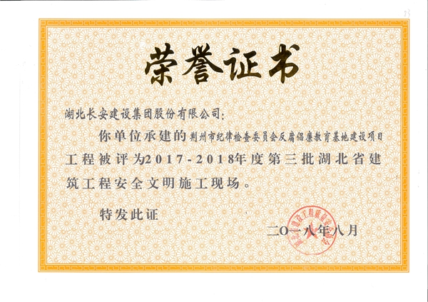 荊州市紀(jì)律檢查委員會(huì)反腐倡廉教育基地建設(shè)項(xiàng)目被評(píng)為2017-2018年度第三批湖北省建筑工程安全文明施工現(xiàn)場(chǎng)