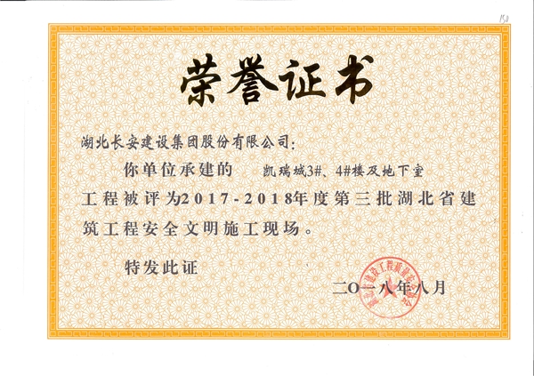 凱瑞城(3#、4#)樓及地下室工程被評(píng)為2017-2018年度第三批湖北省建筑工程安全文明施工現(xiàn)場(chǎng)