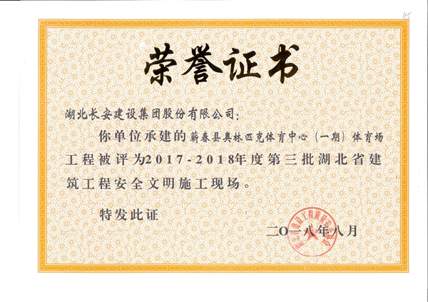 蘄春縣奧林匹克體育中心(一期)體育場(chǎng)工程被評(píng)為2017-2018年度第三批湖北省建筑工程安全文明施工現(xiàn)場(chǎng)