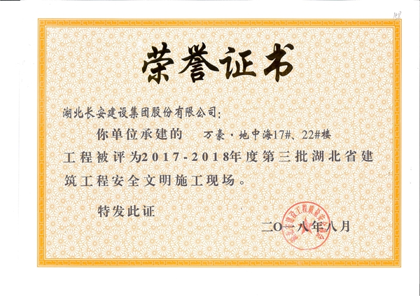 萬豪地中海(17#、22#樓)工程被評(píng)為2017-2018年度第三批湖北省建筑工程安全文明施工現(xiàn)場(chǎng)