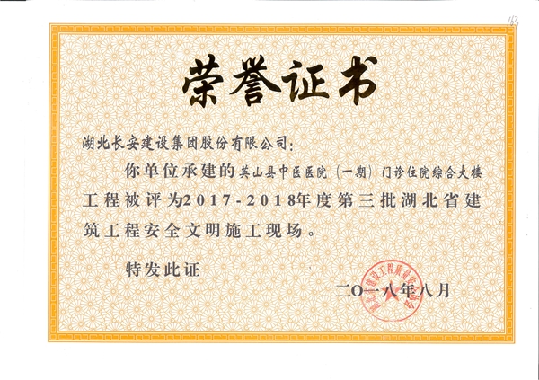 英山縣中醫(yī)醫(yī)院(一期)門診住院綜合大樓工程被評(píng)為2017-2018年度第三批湖北省建筑工程安全文明施工現(xiàn)場(chǎng)