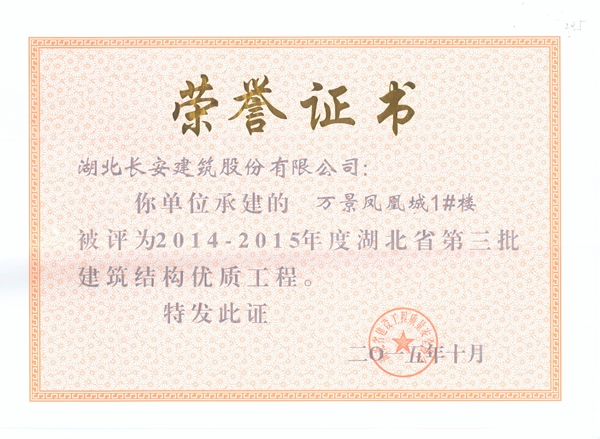 萬景鳳凰城1號(hào)樓建筑結(jié)構(gòu)優(yōu)質(zhì)證書