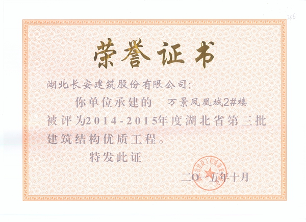 萬景鳳凰城2號(hào)樓建筑結(jié)構(gòu)優(yōu)質(zhì)證書
