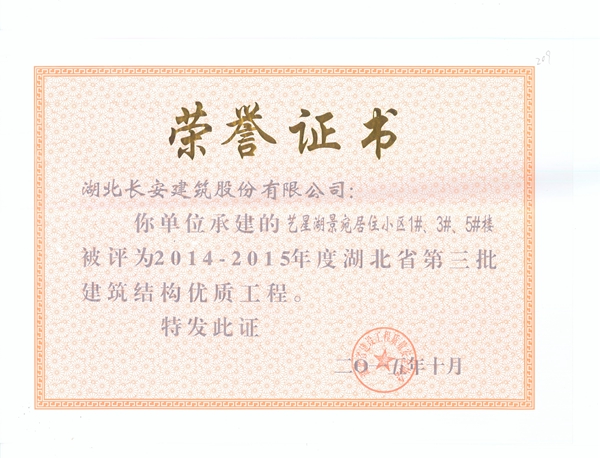 藝星湖景苑居小區(qū)1、3、5號(hào)樓建筑結(jié)構(gòu)優(yōu)質(zhì)證書