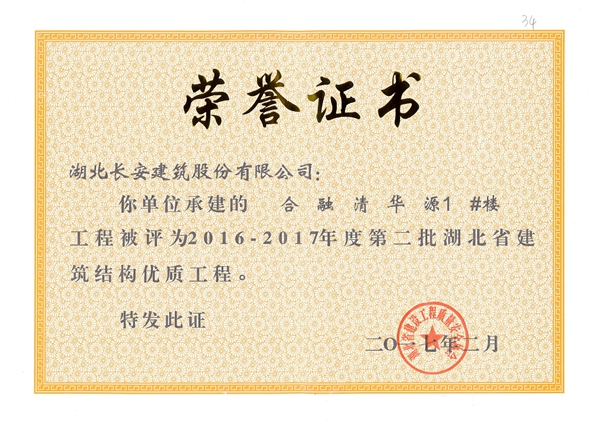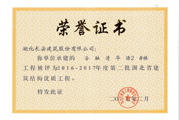 合融清華2#樓被評(píng)為2016-2017年度第二批湖北省第二批省結(jié)構(gòu)優(yōu)質(zhì)工程([2017]4號(hào))