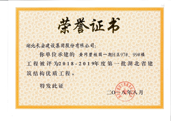 黃岡碧桂園一期H區(qū)(97#、99#)樓工程被評為2018-2019年度第一批湖北省建筑結(jié)構(gòu)優(yōu)質(zhì)工程