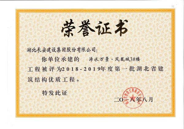 浠水萬景鳳凰城3#樓工程被評為2018-2019年度第一批湖北省建筑結(jié)構(gòu)優(yōu)質(zhì)工程