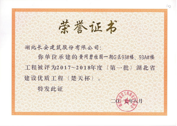 黃岡碧桂園一期G區(qū)93、93A#樓被評為2017-2018年度第一批省建設優(yōu)質工程楚天杯