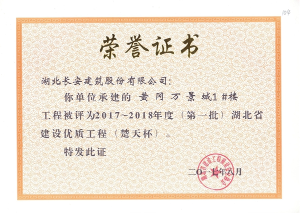 黃岡萬景城1#樓被評為2017-2018年度第一批省建設優(yōu)質工程楚天杯
