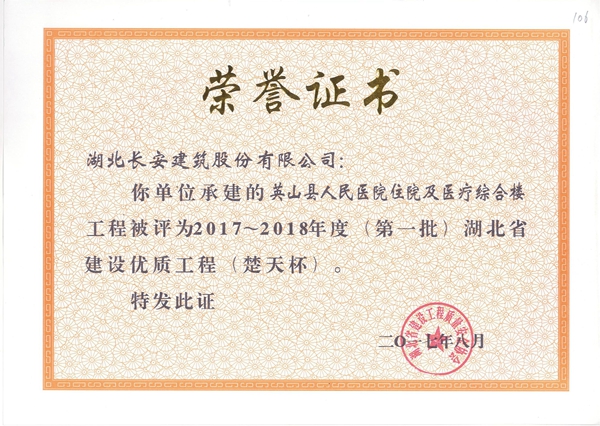 英山縣人民醫(yī)院住院及醫(yī)療綜合樓被評為2017-2018年度第一批省建設優(yōu)質工程楚天杯