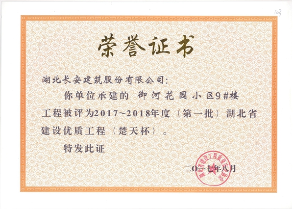 御河花園小區(qū)9#樓被評為2017-2018年度第一批省建設優(yōu)質工程楚天杯