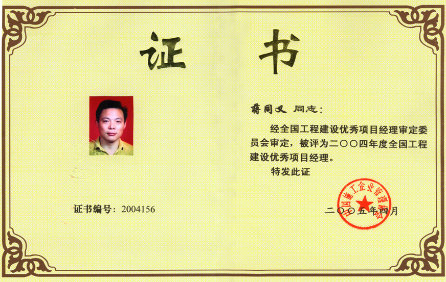 2004年度全國工程建設(shè)優(yōu)秀項目經(jīng)理(蔣同義)