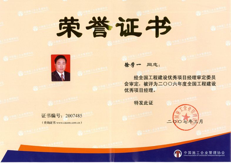 2006年度全國(guó)工程建設(shè)優(yōu)秀項(xiàng)目經(jīng)理(徐學(xué)一)