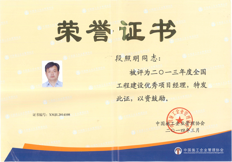2013年度全國工程建設(shè)優(yōu)秀項(xiàng)目經(jīng)理(段照明)