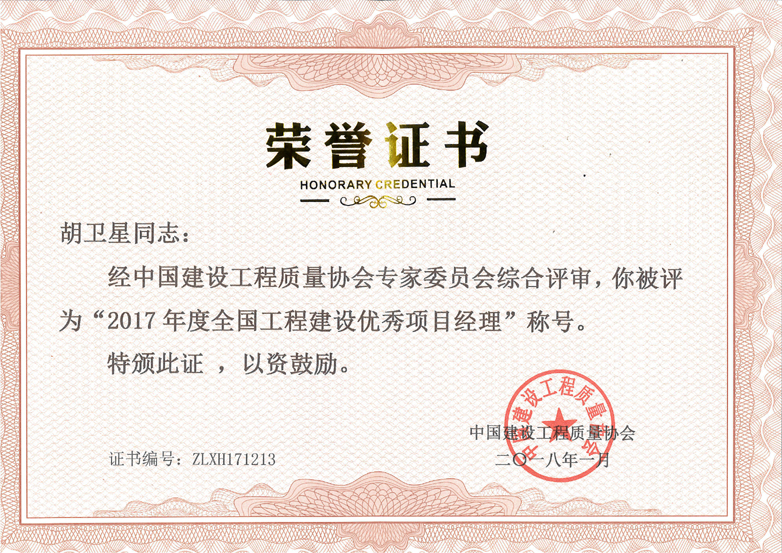 2017年度全國工程建設(shè)優(yōu)秀項(xiàng)目經(jīng)理(胡衛(wèi)星)