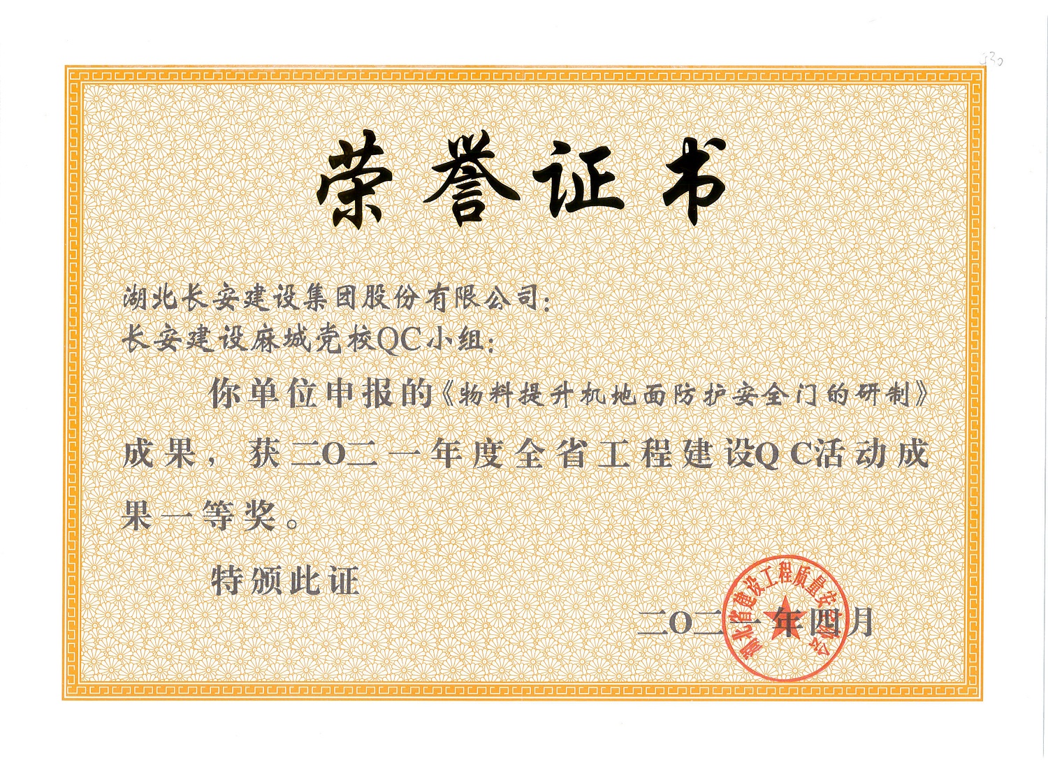 麻城黨校QC小組長安建設(shè)麻城黨校QC小組成果——《物料提升機(jī)地面防護(hù)安全門的研制》榮獲2021年度省QC活動成果一等獎