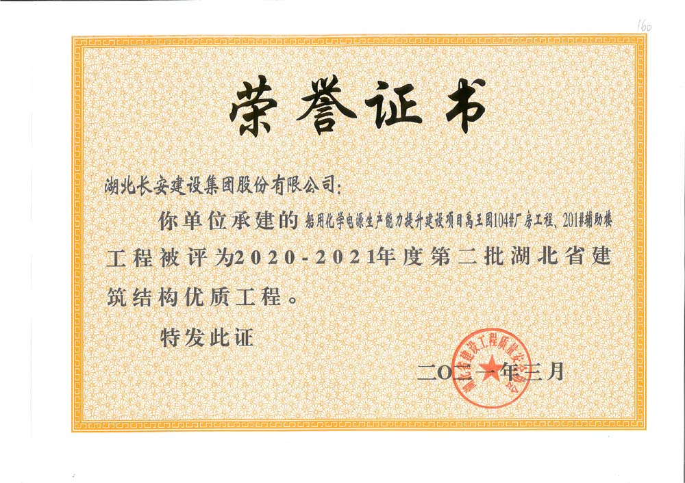 船用化學(xué)電源生產(chǎn)能力提升建設(shè)項(xiàng)目禹王園104#廠房工程、201#輔助樓工程2020-2021年度第二批湖北省建筑結(jié)構(gòu)優(yōu)質(zhì)工程