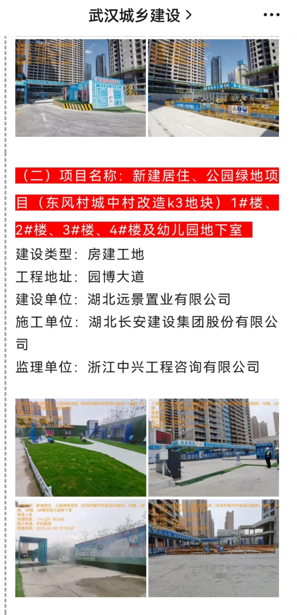 此前的3月29日,湖北省綠色建造科技創(chuàng)新聯(lián)合體觀摩交流會在K3項目召開。最近,在武漢市城鄉(xiāng)建設專班巡查整頓活動中,認定K3項目為“文明施工較好工地”,得到通報表揚。在2021年,H5地塊項目被評為武漢市10月份文明施工流動紅旗建設工地。