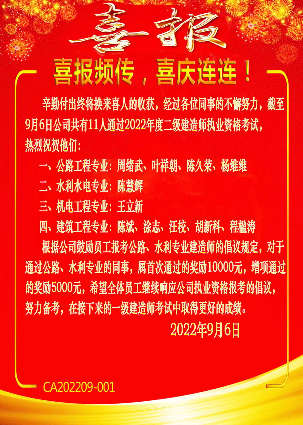 日前,二級建造師執(zhí)業(yè)資格考試名單公布,公司周緒武、葉祥朝等11人順利通過考試,獲得二級建造師執(zhí)業(yè)資格證書。希望全體員工積極響應(yīng)公司執(zhí)業(yè)資質(zhì)報考倡議,努力學習,積極備考,以實際行動和優(yōu)異成績助力公司高質(zhì)量穩(wěn)健發(fā)展。