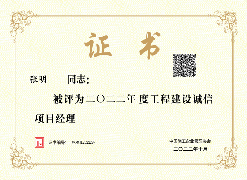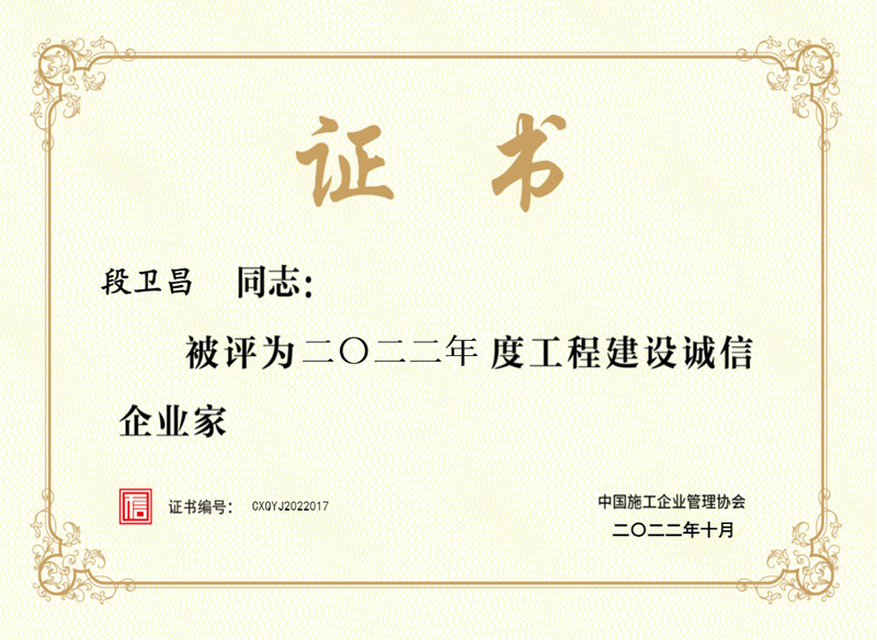 日前,中國施工企業(yè)管理協(xié)會公布了2022年度工程建設(shè)“誠信典型企業(yè)”“誠信企業(yè)家”“誠信項目經(jīng)理”榜單,集團公司被評為“二○二二年度工程建設(shè)誠信典型企業(yè)”,董事長段衛(wèi)昌被評為“二○二二年度工程建設(shè)誠信企業(yè)家”,公司項目經(jīng)理被評為“二○二二年度工程建設(shè)誠信項目經(jīng)理”,充分展現(xiàn)了公司在誠信建設(shè)領(lǐng)域的綜合實力。