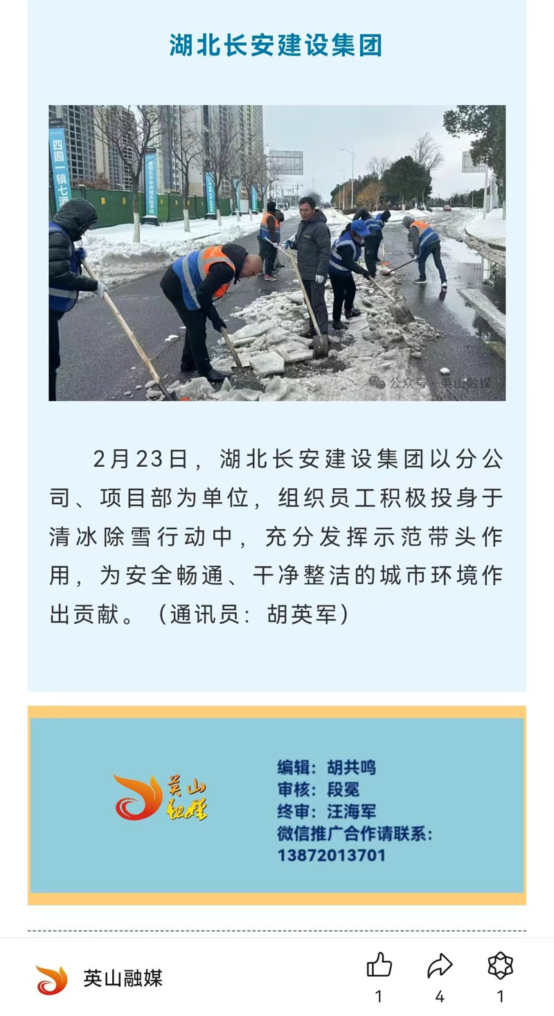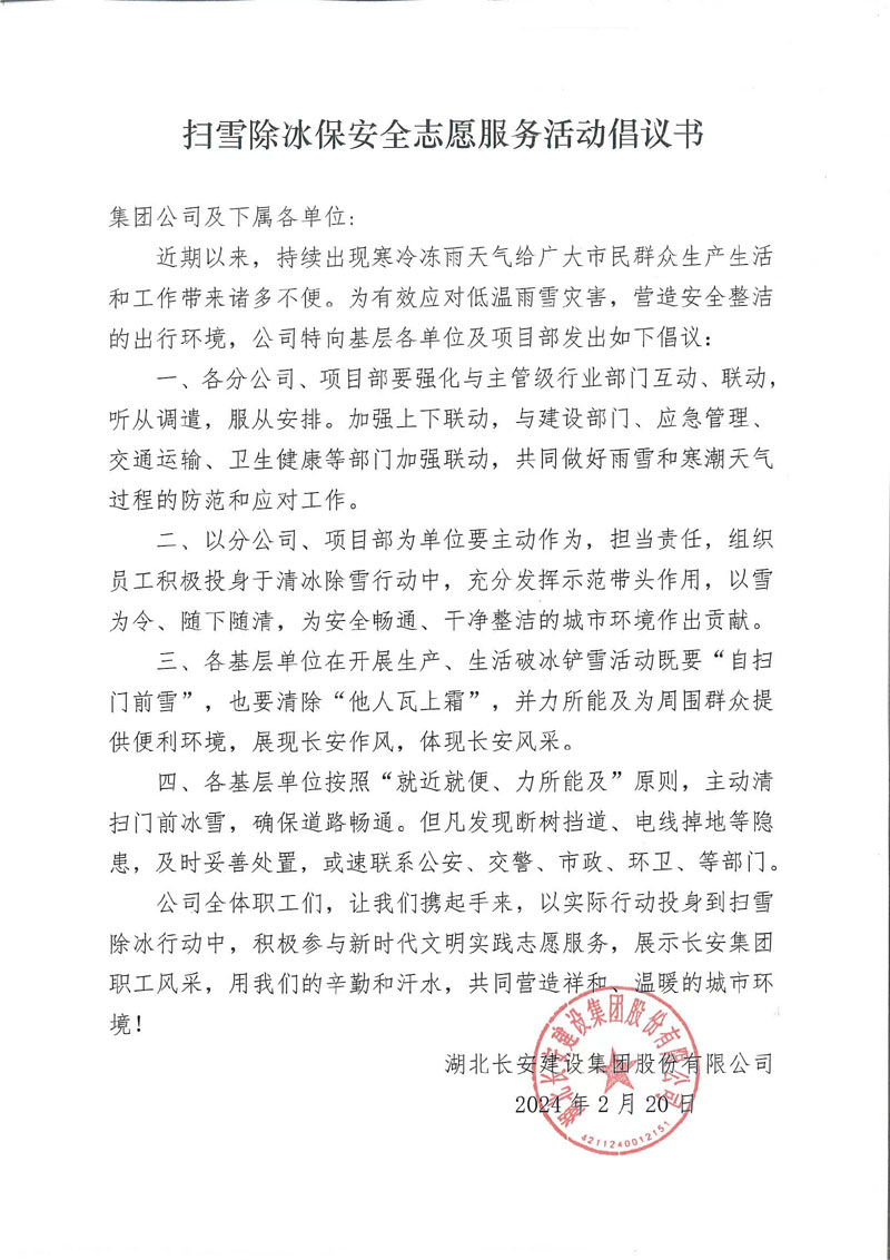 2月20日下午,湖北長(zhǎng)安建設(shè)集團(tuán)向下屬各公司發(fā)布《掃雪除冰保安全志愿服務(wù)活動(dòng)倡議書(shū)》,倡議各分公司、項(xiàng)目部強(qiáng)化與主管級(jí)行業(yè)部門(mén)互動(dòng)、聯(lián)動(dòng)聽(tīng)從調(diào)遣,服從安排。加強(qiáng)上下聯(lián)動(dòng),與建設(shè)部門(mén)、應(yīng)急管理交通運(yùn)輸、衛(wèi)生健康等部門(mén)加強(qiáng)聯(lián)動(dòng),共同做好雨雪和寒潮天氣過(guò)程的防范和應(yīng)對(duì)工作。要求以分公司、項(xiàng)目部為單位,主動(dòng)作為,組織員工積極投身于清冰除雪行動(dòng)中,為安全暢通、干凈整潔的城市環(huán)境作出貢獻(xiàn)。