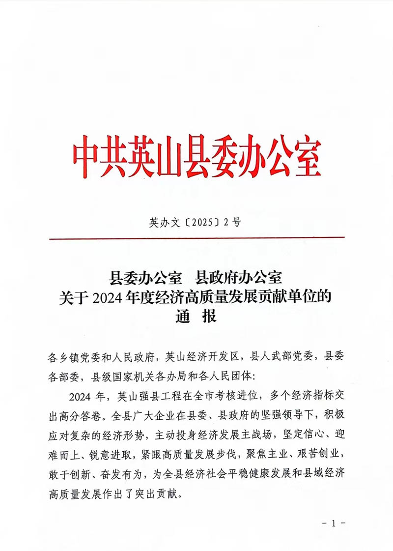 2月10日,英山縣2025年三級(jí)干部會(huì)議在英山縣禮堂召開。集團(tuán)公司榮庸“2024年度經(jīng)濟(jì)高質(zhì)量發(fā)展貢獻(xiàn)單位”稱號(hào),在“2024年企業(yè)納稅貢獻(xiàn)排名前10位”中榮居第1位。