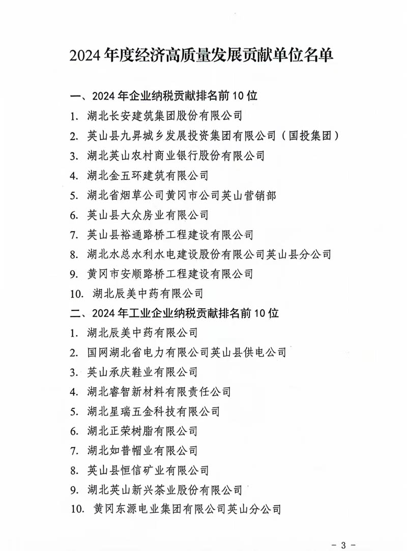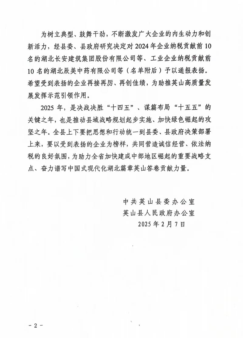 集團(tuán)公司榮獲“英山縣2024年企業(yè)納稅貢獻(xiàn)”排名第1位