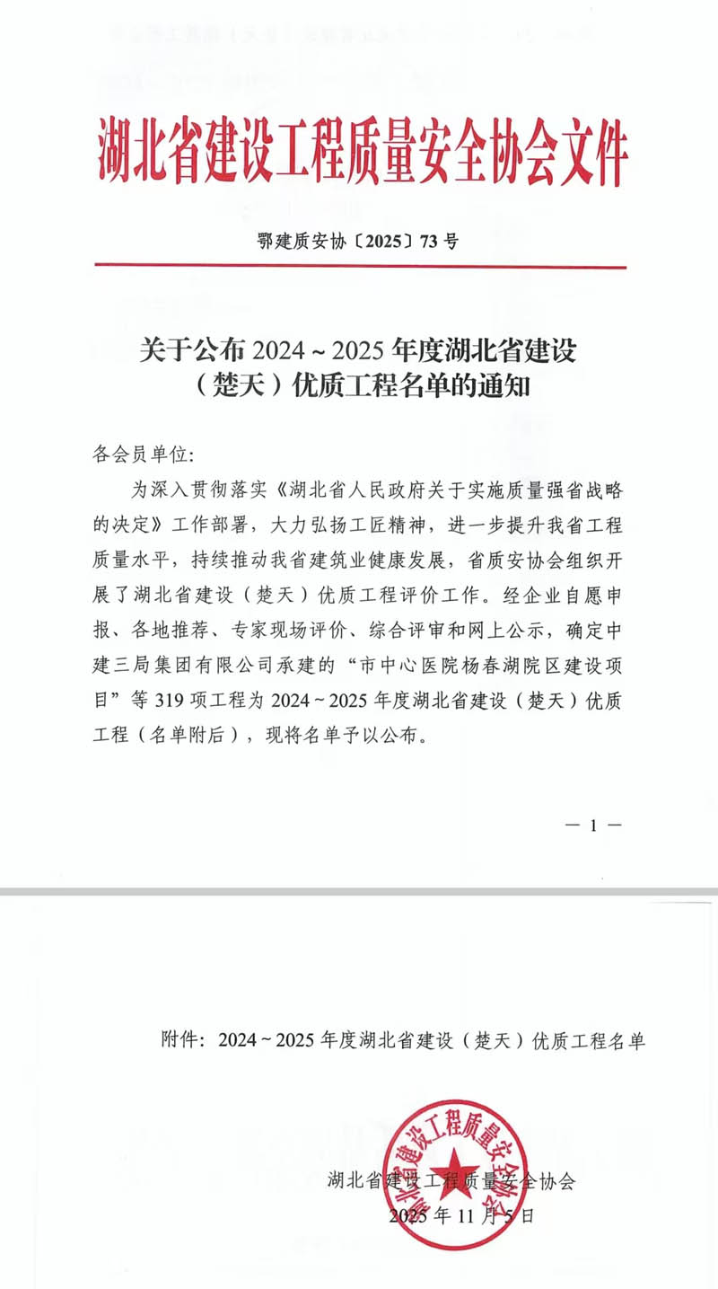 11月5日,湖北省建設(shè)工程質(zhì)量安全協(xié)會公布2024-2025年度湖北省建設(shè)(楚天)優(yōu)質(zhì)工程名單,全省共319個(gè)工程上榜。湖北長安建設(shè)集團(tuán)股份有限公司施工建設(shè)的中勝村城中村改造C產(chǎn)業(yè)地塊、新建居住公園綠地項(xiàng)目(東風(fēng)村城中村改造K3地塊)1#樓及地下室、黃岡職業(yè)技術(shù)學(xué)院新校區(qū)擴(kuò)建項(xiàng)目一期(實(shí)訓(xùn)樓、圖書館)等9項(xiàng)工程獲評該榮譽(yù),獲獎(jiǎng)?wù)急燃s2.82%。