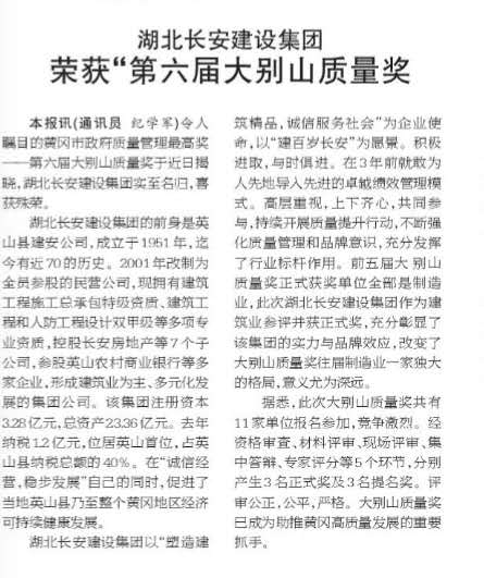 湖北長安建設集團榮獲“第六屆大別山質(zhì)量獎”
