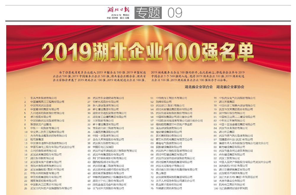 熱烈祝賀集團(tuán)公司榮獲2019湖北企業(yè)100強(qiáng)第54位